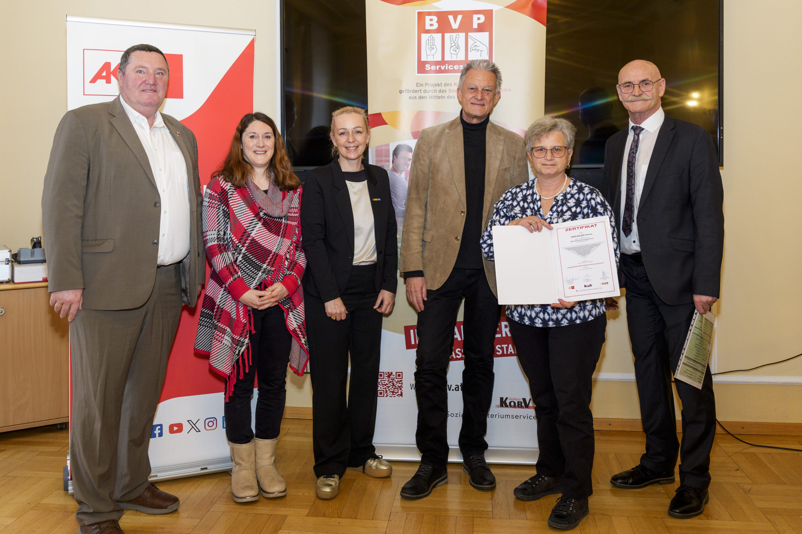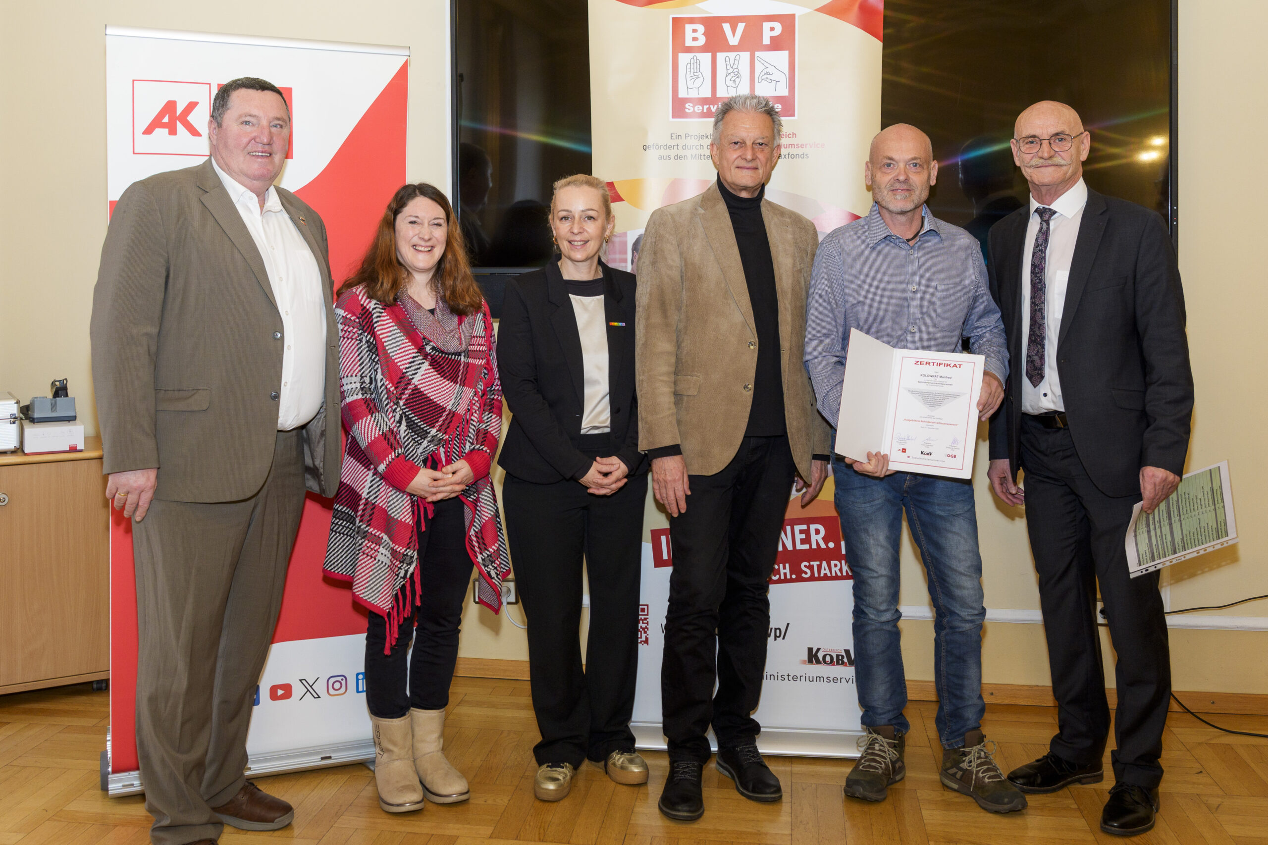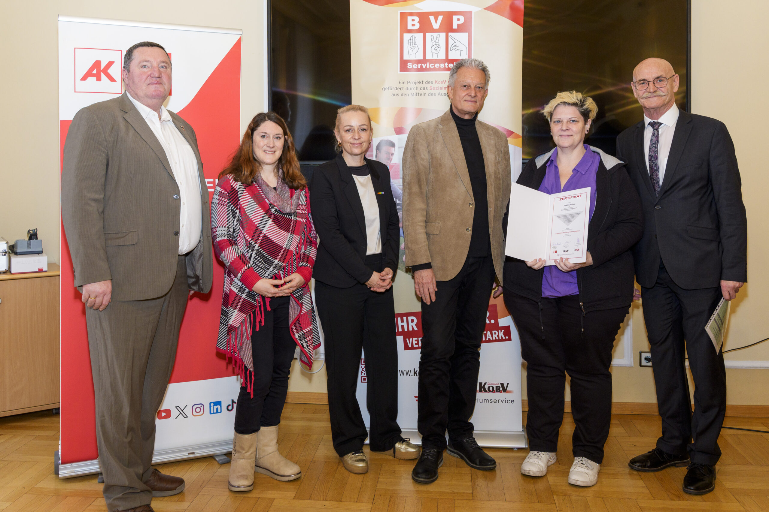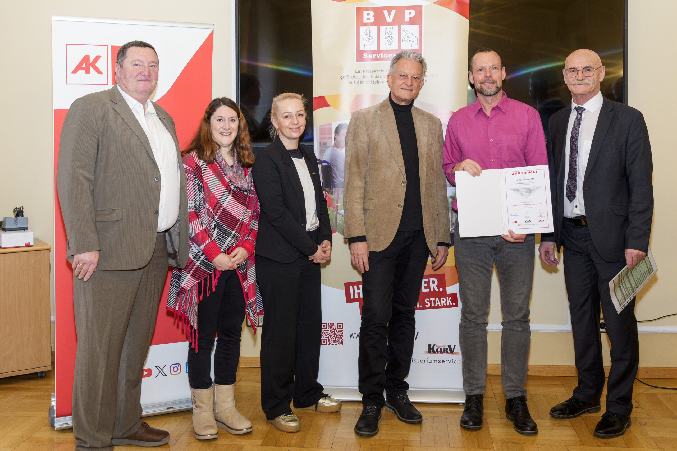 Im Rahmen eines feierlichen Festaktes der 19. BVP-Zertifizierung, abgehalten im Sozialministeriumservice, begrüßte KOBV-Präsident Franz Groschan die zahlreichen Gäste, ehe Vizepräsident Helmut Gruber von der AK Wien seine Gedanken mit dem Publikum teilte. Auch Hofrat Harald Gruber, Amtsleiter im Sozialministeriumservice, und Nina Dirnweber vom VÖGB hielten eine Ansprache. Vor der Verleihung der Zertifikate dankte Mag.a Christine Steger, Anwältin für Gleichbehandlungsfragen für Menschen mit Behinderungen, den Absolvent:innen für ihren Einsatz und ihr Engagement.