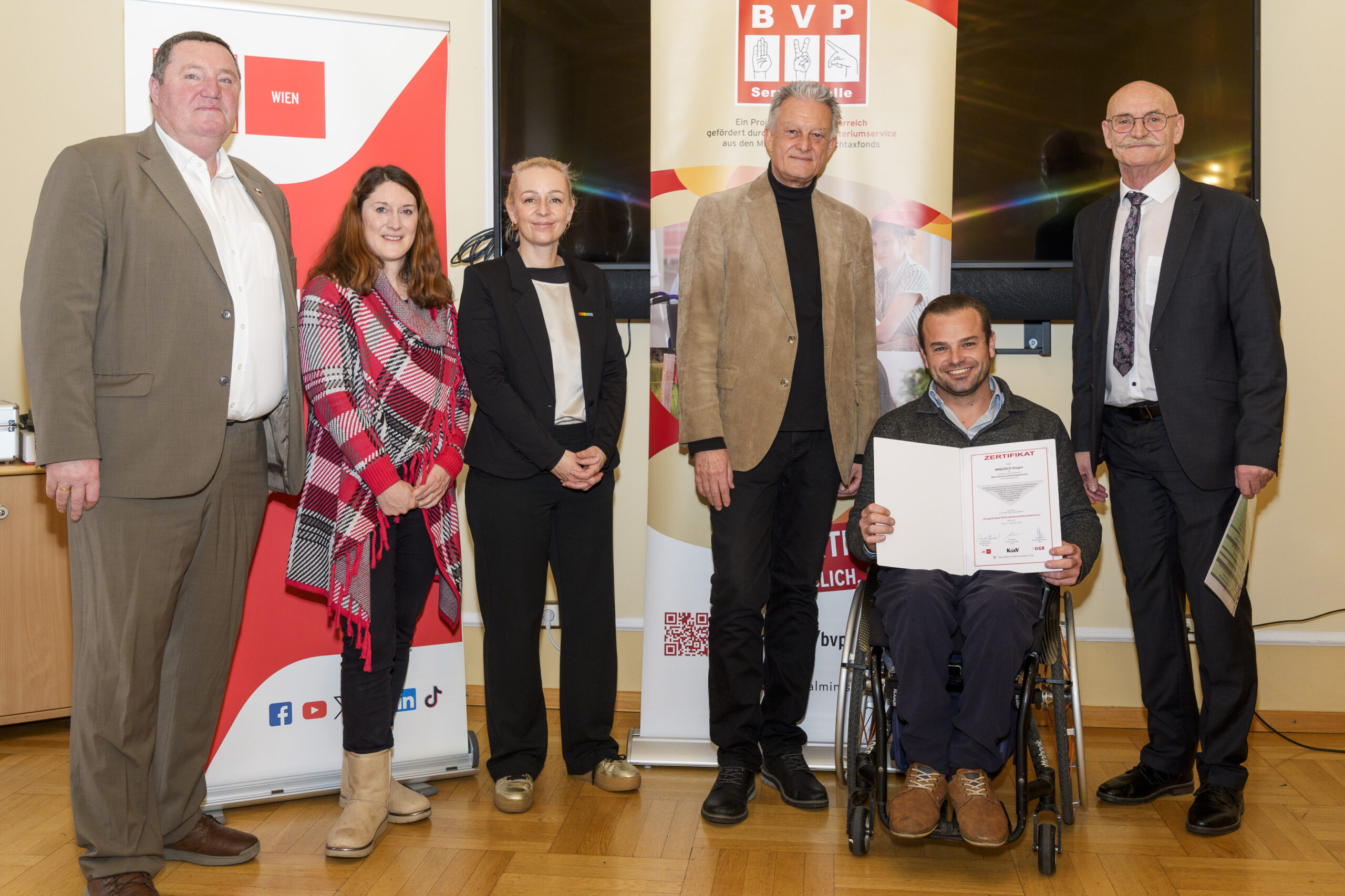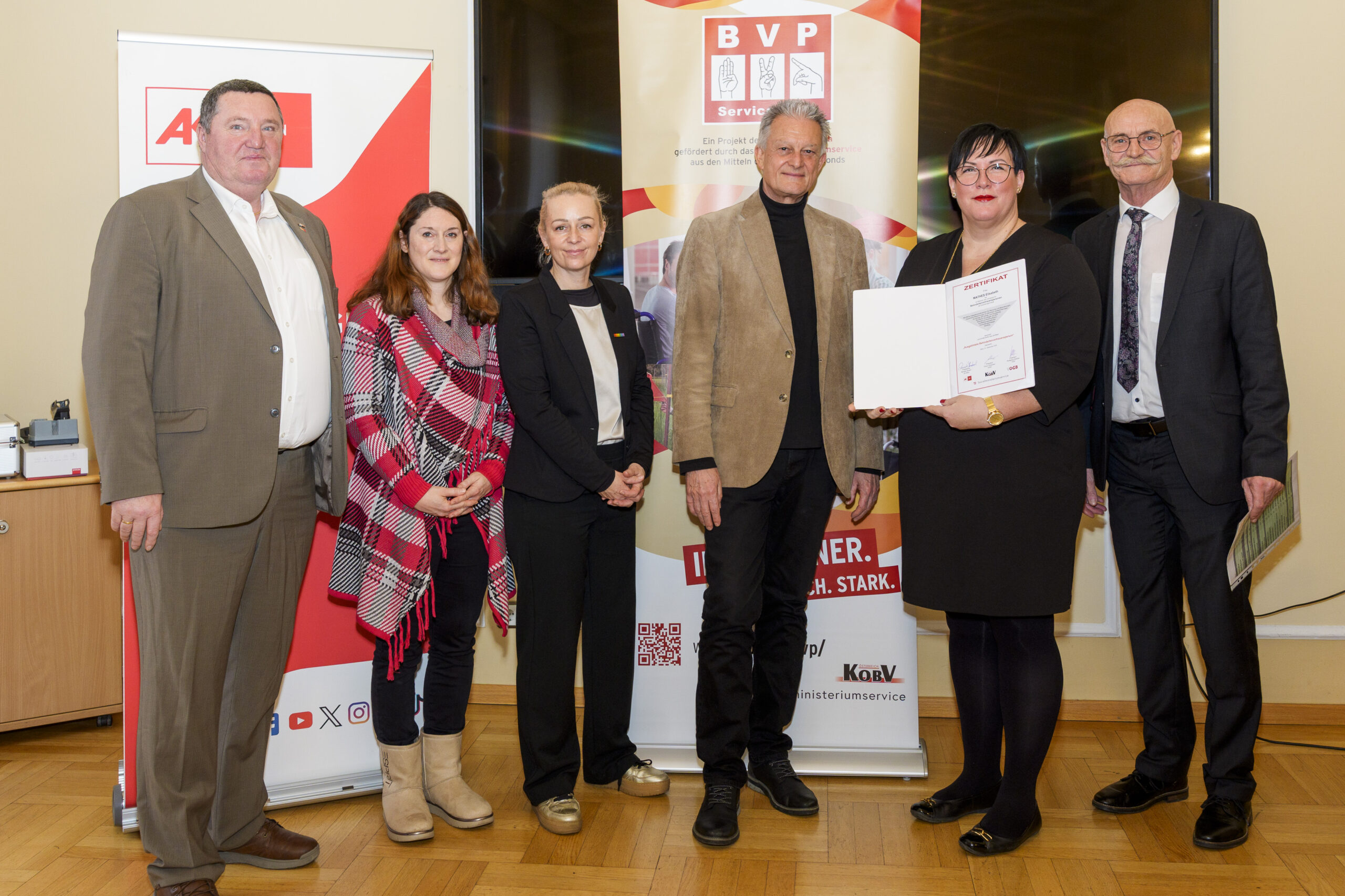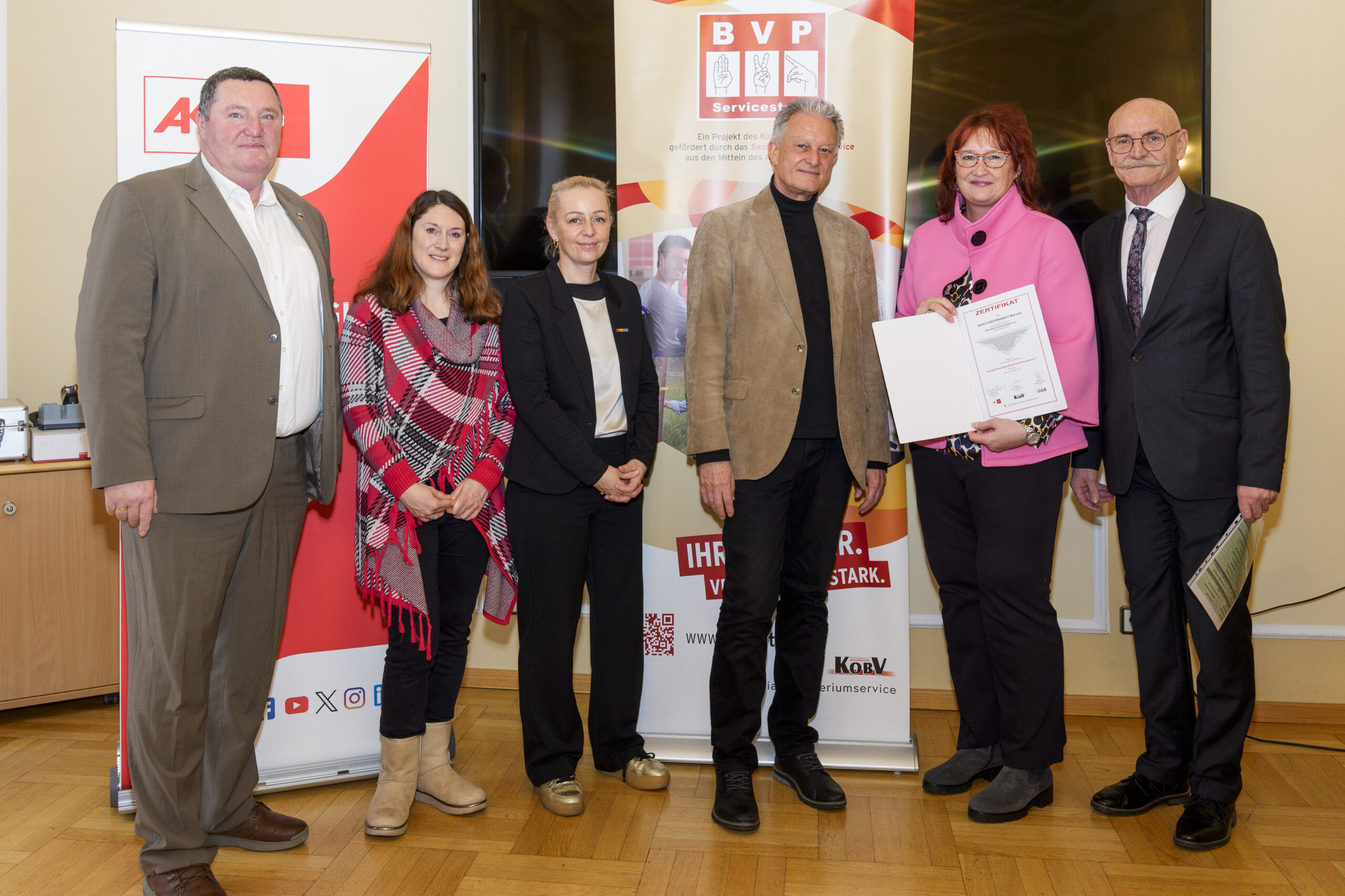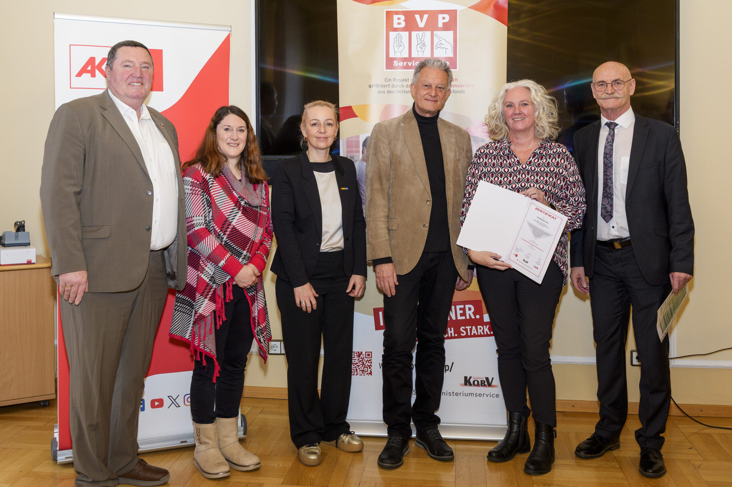 Im Rahmen eines feierlichen Festaktes der 19. BVP-Zertifizierung, abgehalten im Sozialministeriumservice, begrüßte KOBV-Präsident Franz Groschan die zahlreichen Gäste, ehe Vizepräsident Helmut Gruber von der AK Wien seine Gedanken mit dem Publikum teilte. Auch Hofrat Harald Gruber, Amtsleiter im Sozialministeriumservice, und Nina Dirnweber vom VÖGB hielten eine Ansprache. Vor der Verleihung der Zertifikate dankte Mag.a Christine Steger, Anwältin für Gleichbehandlungsfragen für Menschen mit Behinderungen, den Absolvent:innen für ihren Einsatz und ihr Engagement.