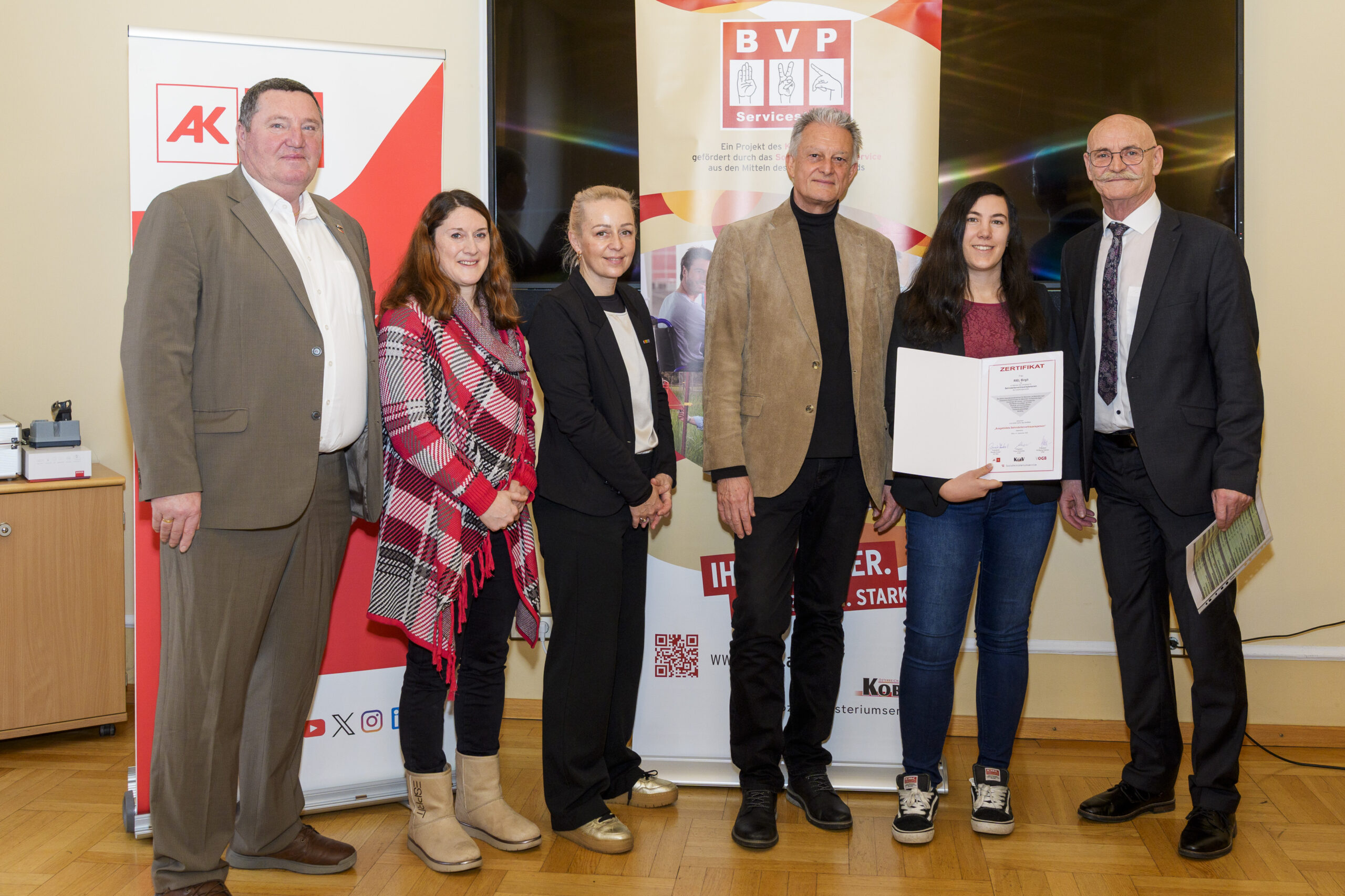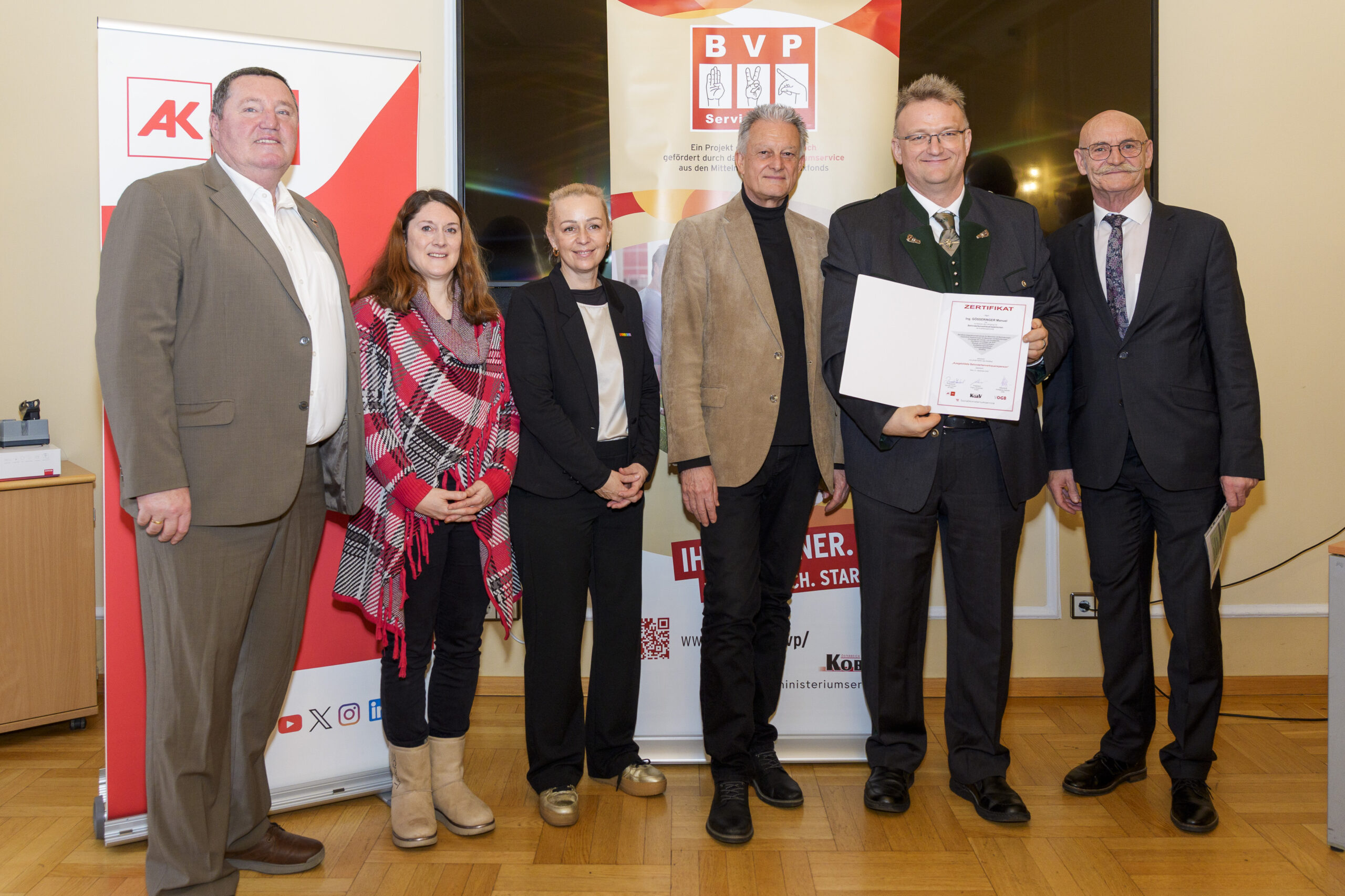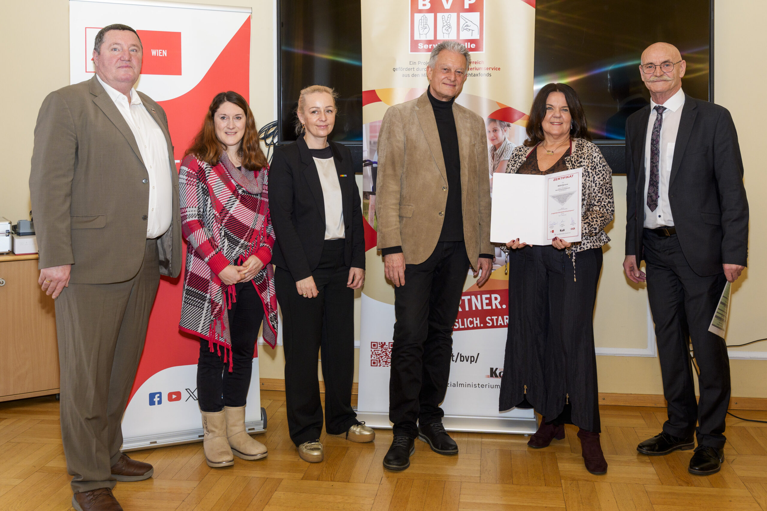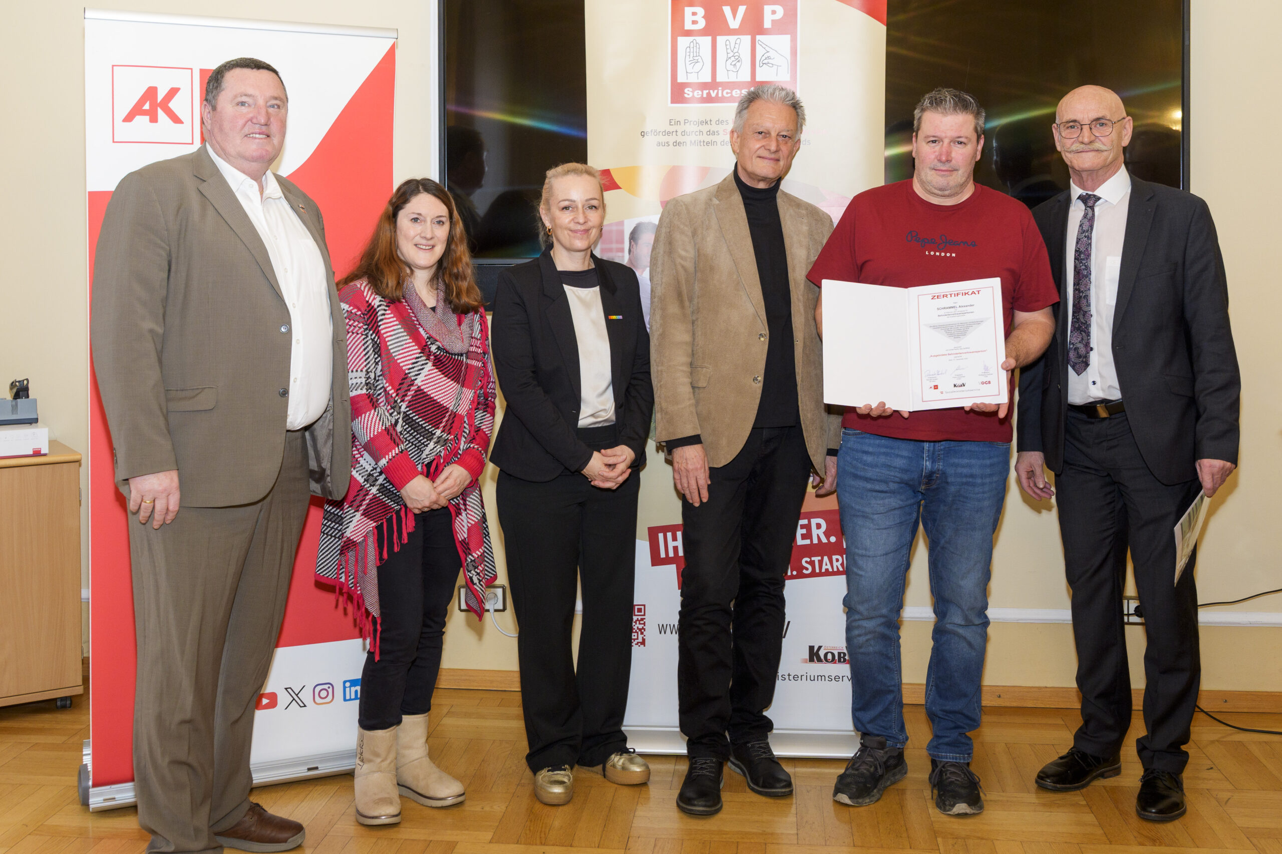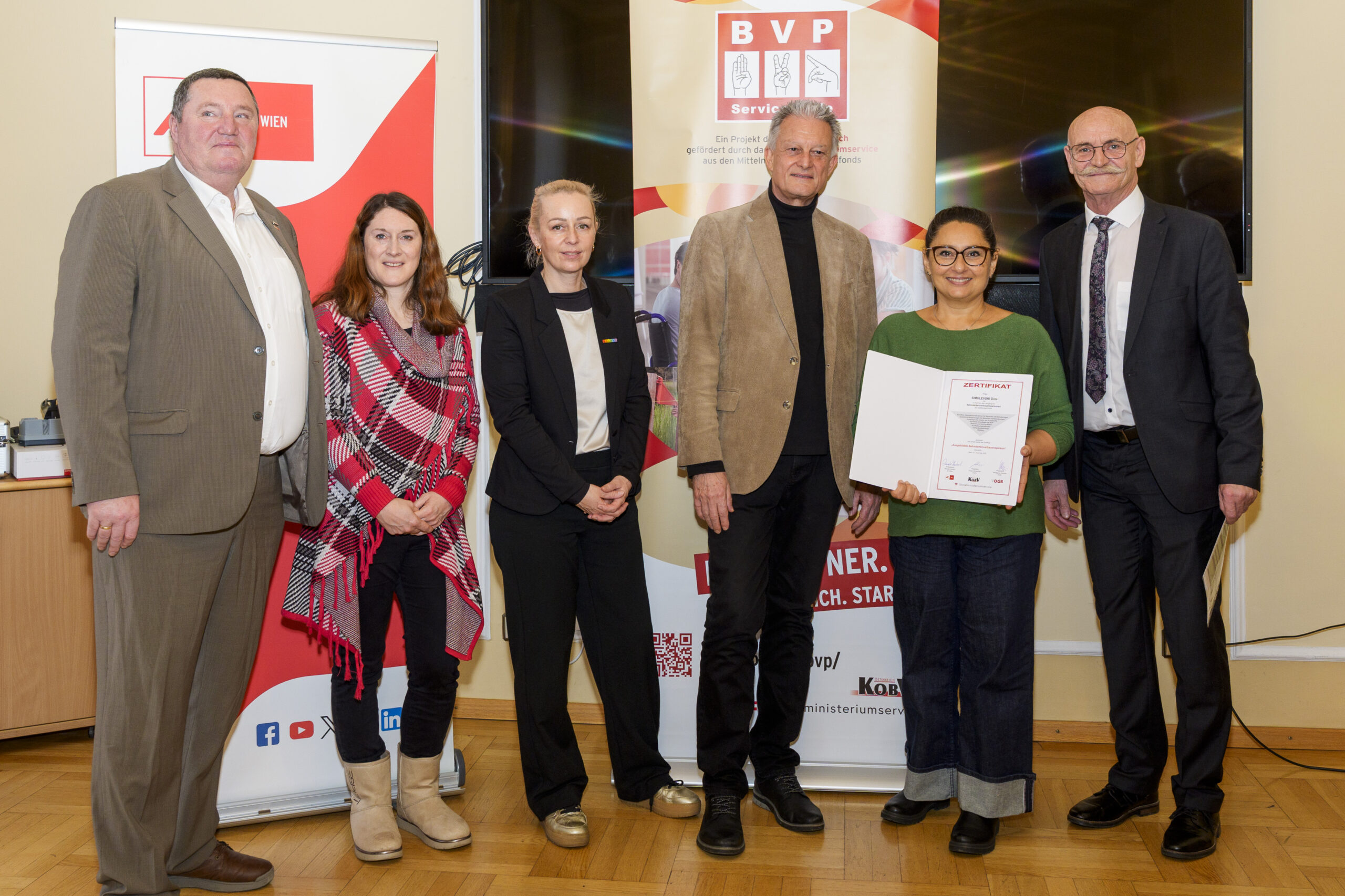 Im Rahmen eines feierlichen Festaktes der 19. BVP-Zertifizierung, abgehalten im Sozialministeriumservice, begrüßte KOBV-Präsident Franz Groschan die zahlreichen Gäste, ehe Vizepräsident Helmut Gruber von der AK Wien seine Gedanken mit dem Publikum teilte. Auch Hofrat Harald Gruber, Amtsleiter im Sozialministeriumservice, und Nina Dirnweber vom VÖGB hielten eine Ansprache. Vor der Verleihung der Zertifikate dankte Mag.a Christine Steger, Anwältin für Gleichbehandlungsfragen für Menschen mit Behinderungen, den Absolvent:innen für ihren Einsatz und ihr Engagement.